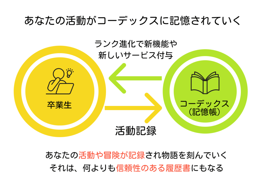 あなたの人生の実績や軌跡は、もう1つのNFT「コーデックス(記憶帳)」に記録され、コーデックスのランクやステータスが、どのくらいのサービスを受けられるかの基準となります。